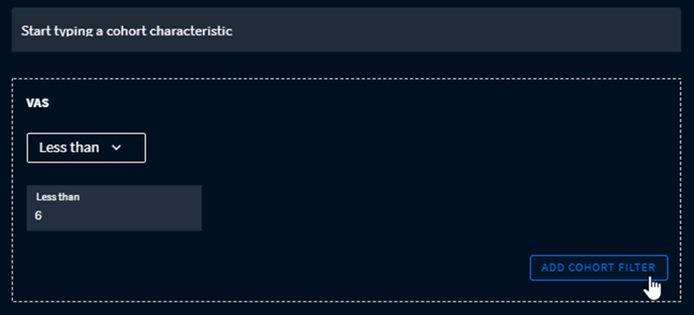 Can I Select a Scoring Group as a Cohort Filter? Yes. You can filter your data in the report by the calculated result of a scoring group (KOOS Pain, VAS, BMI, etc.) Once the scoring group has been selected, you are asked to define the range which is to be filtered.