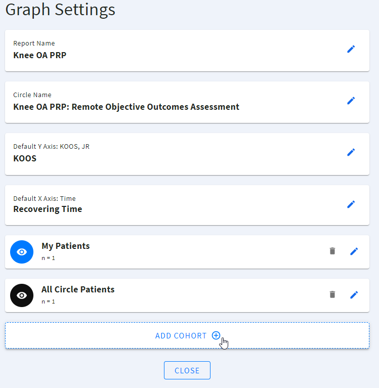 Once the Report Template has been created, you'll see two default cohort filters on the right. The first one – My Patients - (marked with a blue eye) displays only your patients' data, while All Circle Patients (marked with a black eye) displays the data of all the cases created within your Circle, i.e., your patients + the patients of all your Circle members. But all the Cohorts are totally customizable, and you can select any option for any Cohort filter to display.