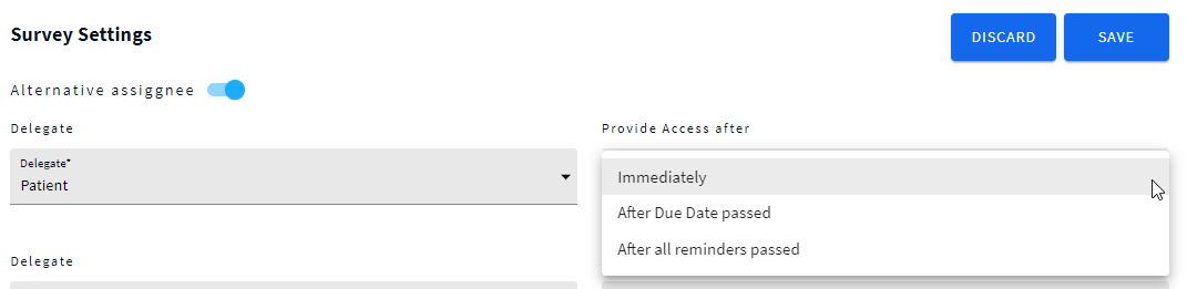 - Service Provider. Service Providers can be assigned not only as separate assignees but also as alternative assignees to assist in completing surveys. You can select whether to provide access to the survey for a service provider immediately or after the due date/all reminders passed.