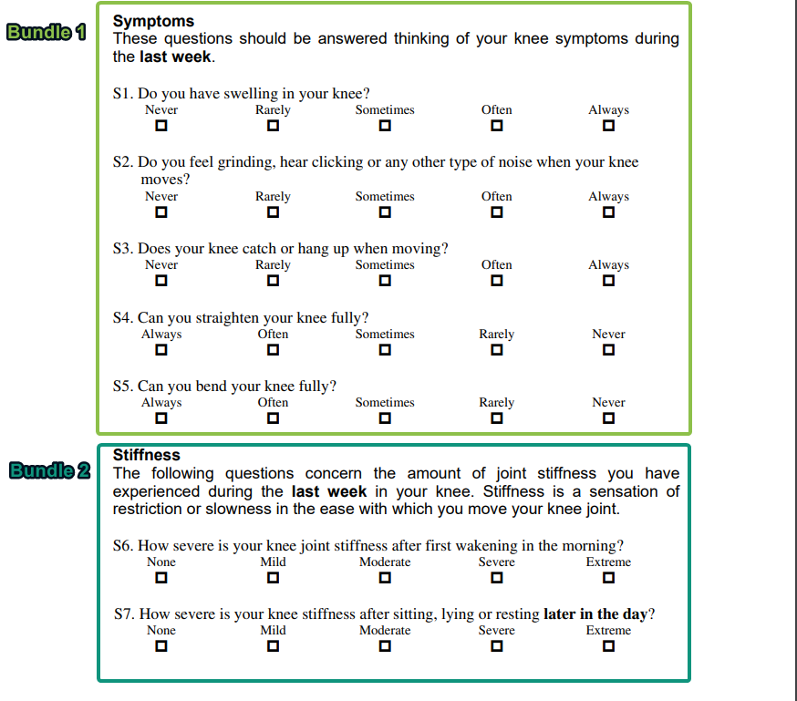 For example. a bundle might comprise 3 questions about the patient: (1) Pain while sitting, (2) Pain while standing and (3) Pain while walking. Each answer may have the options Severe, Moderate, Mild, which allows the patient to select the option which based matches their subjective assessment. Behind the scenes, these answers are correlated to values (Severe = 3) which then allows for the Bundle to support the algorithmic generation of a score.