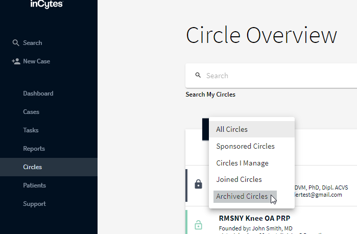 2. Select Archived Circles using the filter at the top of the Circle list and click on the required Circle.