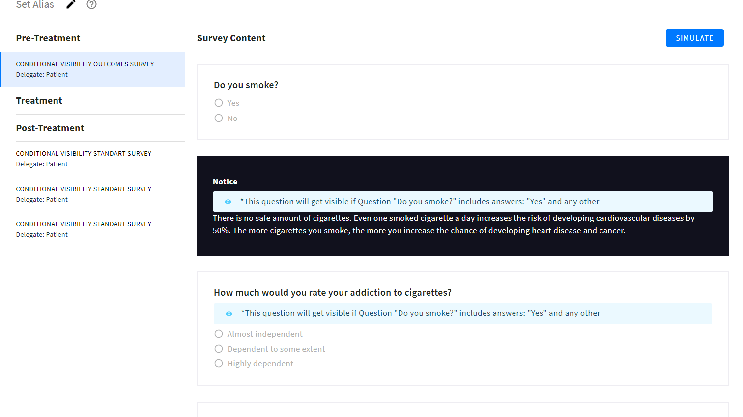 Tip: Click SIMULATE to see how the survey will look for the survey delegate. This option is especially useful for surveys with conditional visibility. To return to the “raw” survey structure, click SHOW SURVEY CONTENT