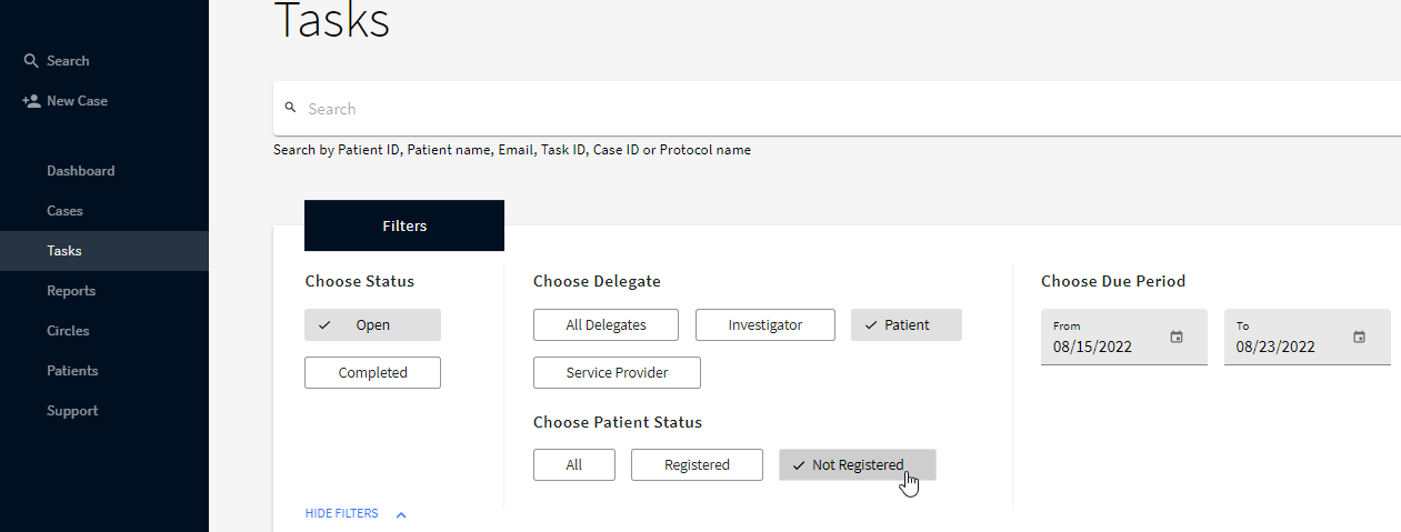 Furthermore, you can filter to display only patients who have not completed their registration. To do this, select:
