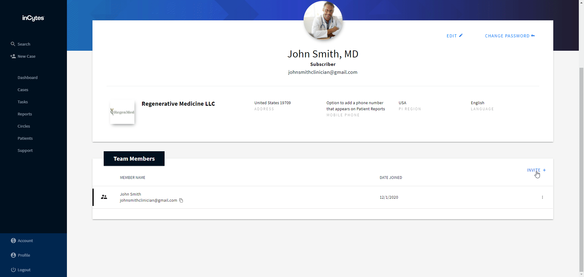 Every user has an opportunity to invite one or more team members. These team members are granted full access to your account and can help assist with certain functions, such as case creation, patient enrollment, or circle management.