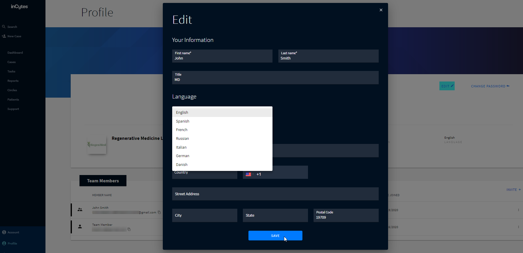 Note: You can also select the preferred language of communication for the patient. By doing so, the patient will get the invitation email in their preferred language. You can make this selection when adding a new patient or during the patient editing process. Afterward (if required), your patients can change the language settings at their personal patient portal.